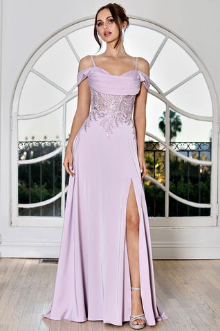 Off Shoulder Spaghetti Straps A Line Dress. Slitted Skirt, Floor Length, Bead Work Illusion Top, Pleats.