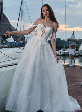 Style HW3413 exudes shimmering glamour, with a mix of gilded lace that will dazzle those walking down the aisle. The off-the-shoulder sweetheart neckline is paired with a cutout draped bodice that hugs the natural figure perfectly. At the basque waistline, the voluminous ball skirt blooms out, embellished with bold gilded lace. Lace detailing adds a romantic touch to this wedding dress from the bodice to the hem. A true princess ball gown, this gorgeous, sparkling wedding dress is sure to turn heads with its dazzling embellishments and timeless romance. This wedding dress is also available in plus sizes.
