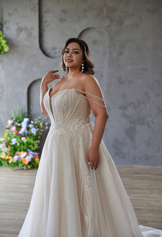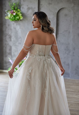 This wedding dress uses a strapless sweetheart design to outline elegant shoulder and neck lines. Delicate beaded chains drape around the arms, adding a touch of ingenious ingenuity. The bodice combines three - dimensional tailoring with exquisite beadwork and embroidery, fitting the figure perfectly while exuding luxury. The large A - line tulle skirt is light and fluffy, and the skirt continues with delicate embellishments. It is simple yet full of details, suitable for diverse wedding styles.